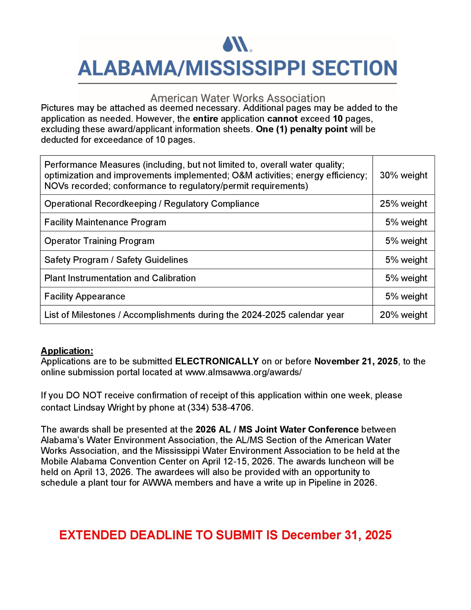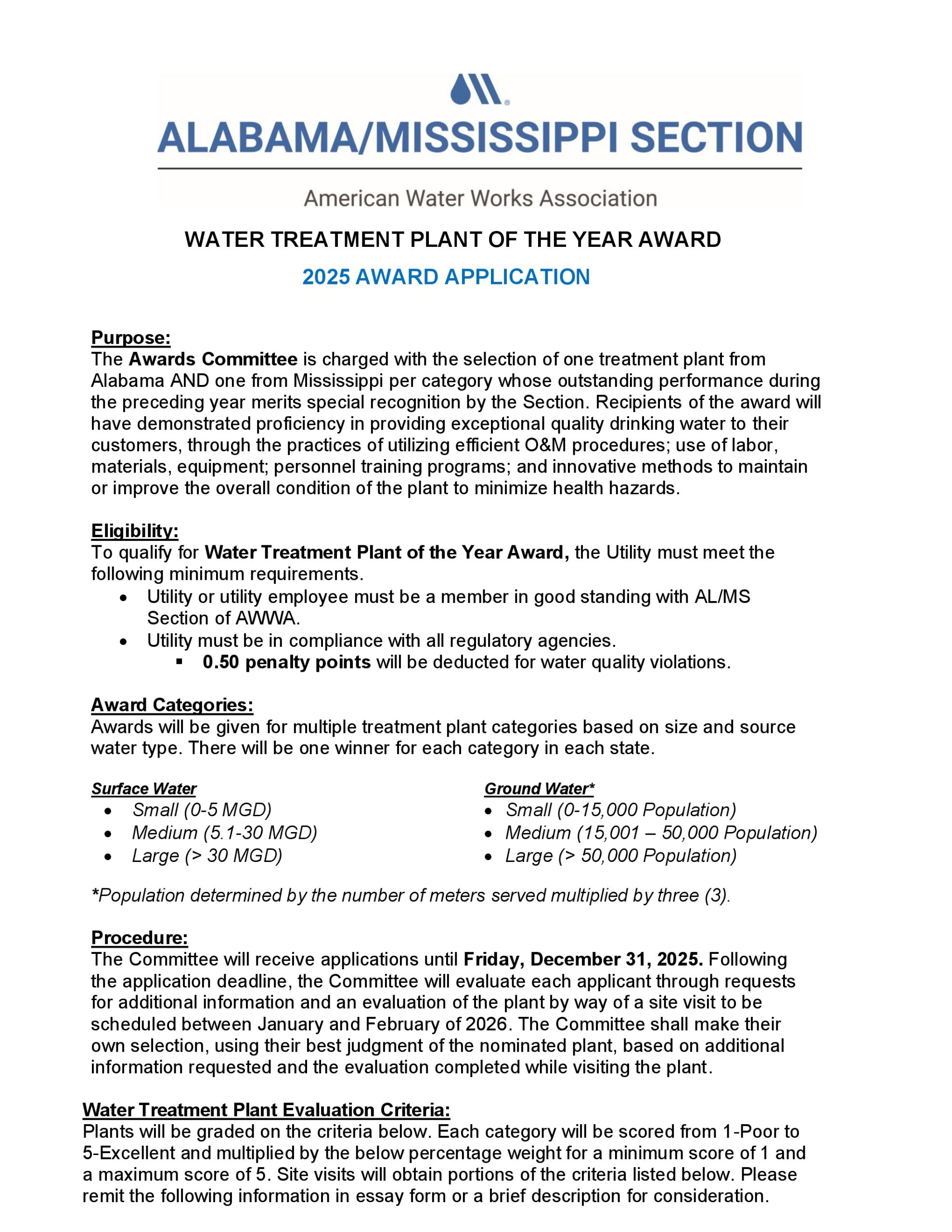 The AL/MS Section will select a Plant, Distribution System, Operator, and Young Professional from Alabama and Mississippi whose outstanding performance during the preceding year merits special recognition by the Section. The AL/MS Section is currently accepting nominations for Water Treatment Plant of the Year. All other awards nominations will open soon. Treatment Plant of the Year submission date is December 31, 2025.